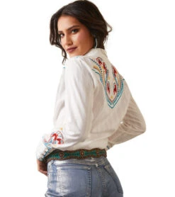 Ariat Martina Floral Yoke Snap Shirt for women features lightweight white cotton and colorful folk art embroidery for classic Western style. Fresh and cool Martina Snap Shirt from Ariat has full yokes in front and back filled with floral embroidery and zig-zag accents. The lower sleeves are embroidered and finished with long cuffs.