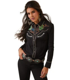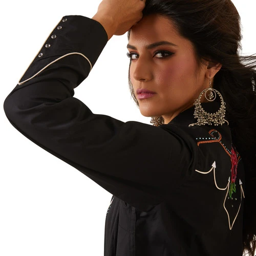 Ladies Wynette Shirt from Ariat is classic black with cream colored piping and smile pockets. The back yoke is edged with piping and embroidered arrow points to match the smile pockets. Clear and turquoise crystals and crystal snaps make the Wynette Shirt sparkle in the lights. Charming embroidery in front and back includes a cactus, horseshoe, horse head, rose, rope, and stars. Ariat Wynette Cactus Yoke Snap Shirt is a beauty and is all-cotton for year-round comfort.