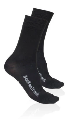 From the wildly popular manufacturer of therapeutic horse products, the Back on Track Socks are much loved by our customers for traveling, for controlling swelling in sore feet, or any time you want to keep your feet happy and comfortable. The ceramic particles embedded in Polypropylene fabric of these socks reflect body heat as infrared waves. This reflected heat offers pain relief and healing to inflamed ligaments, tendons, and joints in your feet by increasing blood flow to the injured area. These delightful socks can be used therapeutically and as a preventative measure. Sold as a pair.
