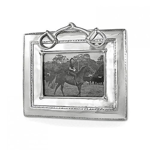 Snaffle Bit Frame from Beatriz Ball is a luxurious decorative frame to showcase a special 5 x 7 photograph. Perhaps you have the perfect shot of your horse, a darling picture of your leadline child at his first show, or a vintage black and white photo of your grandmother who first sat you on a pony. Whatever the memory may be, it will be that much more special presented in this gorgeous picture frame. The shiny silver horse themed frame is a tarnish-free aluminum alloy that won’t dull over time.