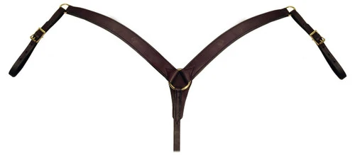 Gorgeous Dark Oil Contour Breast Collar from Berlin Leather is made with supple English bridle leather. Contoured to taper from 1 3/4 ” wide at the front to 1″ wide at the top. Tugs measure 3/4″ and are attached with solid brass rings. Brass buckles and center ring, too. Girth strap adjusts with conway buckle. Berlin’s signature heavy oil gives a lovely feel to this quality Western tack.
