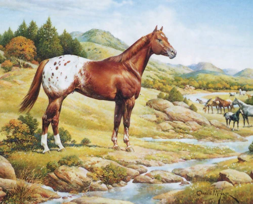 The Appaloosa Horse Club (ApHC) commissioned Orren Mixer to paint a portrait, which featured a chestnut blanket Appaloosa stallion. The landscape painting features mares and foals with a variety of the breed’s coat colors and patterns. The 1981 painting still hangs in the ApHC’s offices in Moscow, Idaho. The Ideal Appaloosa image now joins the Breyer herd as a stunning Limited Edition collectable.