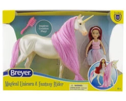 Fantasy Rider Meadow has red hair that’s ready for styling with the included brush. She is an articulated rider doll so she can ride and care for her beautiful unicorn. She is dressed in a fancy outfit to complete the fantasy theme. Breyer Magical Unicorn Sky and Fantasy Rider Meadow is a wonderful complete play set for unicorn enthusiasts.