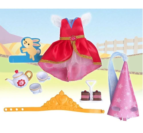 - Includes: Princess dress, pony princess hat, teapot with two tea cups, tray with pretend tea cakes, bunny paper finger puppet