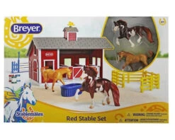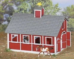 Breyer Stablemates Red Barn is a great place for your herd of Stablemates horses! This bright red & white Stablemates barn is a must-have for Breyer Stablemate fans! Made of durable plastic, this three stall barn features a tack/storage area, four corral fences, jump, water trough, and three race barrels. Includes 2 Stablemates horses, too! This Breyer mini play set has been a Parent’s Choice Awards winner and was one of the American Specialty Toy Retailer’s Association’s 25 Best Toys for 2008. Lots of play value and creativity allowed, so your child can use his or her imagination. Size 11″ H x 7″W x 10.5″L. Some assembly required – view the video to see how it’s done!