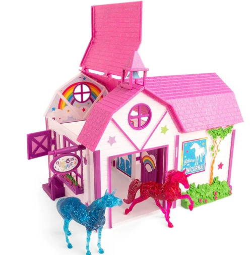 A new Breyer unicorn barn is in town! The Stablemates Unicorn Magic Sparkle Playset is brimming with glittering goodness. The barn actually sparkles and there are bright colors and fun trim everywhere. This is a great little toy set to take on trips around town or far away.