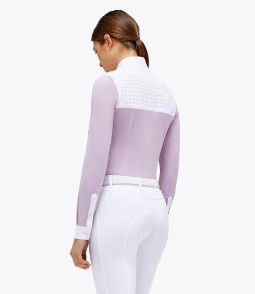 Ladies Cavalleria Toscana Jacquard Bib Long Sleeve Show Shirt is gorgeous as well as supremely functional for equestrian sport. The incredibly comfortable technical jersey fabric plus CT fine touches and details represent the best of this beloved Italian brand. The Jacquard Bib competition shirt is available in All-White or a lovely Light Mauve color with white bib, show collar, and cuffs.