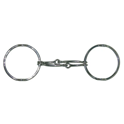 A commonly used Polo bit, the Double Mouth Jointed Loose Ring Gag Bit, or Barry Gag, is made of stainless steel. The double mouth, jointed mouthpiece and loose ring gag cheeks make this English bit effective for horses that need to lighten up on the front end, pull on the bit, or need encouragement to emphasize balance on the hind end. The Double Jointed Loose Ring Barry Gag bit is available in size 5 that fits most horses.