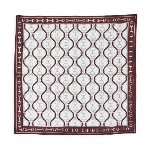 The pattern in white and brown features interlocking horse bits and leather straps. The brown border features bits and a stripe. The look is very rich and elegant and the style can be traditional or contemporary. The Equus Cloth Napkins Set includes four napkins in a 20″ square size.