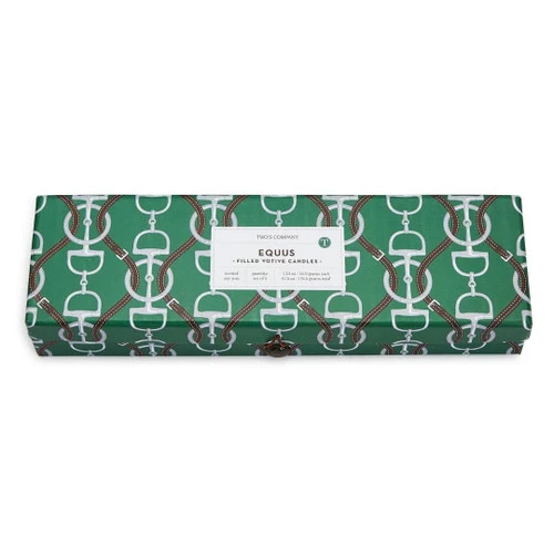 Equus Votive Candles Set features custom scents that are perfect for adding warm fragrance to your home. Soy wax burns slower and cleaner than paraffin and comes from a renewable resource. Each candle will burn for approximately 7 hours. Once the candles are finished you can refill the glass with another votive candle or pillar. Equus Votive Candles Set is gift boxed. The attractive green box has a bits and bridle motif that makes a lovely presentation for a special gift.