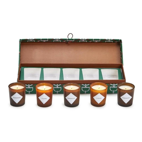 Equus Votive Candles Set includes five scented votive candles in a handsome equestrian themed gift box. There are 2 candles in Clover scent and 3 candles in Barnwood scent. The small votive candles are made with environmentally friendly soy wax.