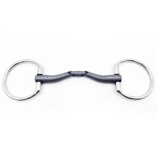Fager Maria Titanium Fixed Ring bit has a double jointed mouthpiece that divides pressure between the tongue and bars. This comfortable lozenge bit shapes gently around the tongue and does not put constant pressure on the bars. The Maria mouthpiece works well for horses that feel heavy, stiff, won’t soften, and are not comfortable with other bits you have tried. The Fager Maria Titanium Fixed Ring is FEI and USEF dressage legal.