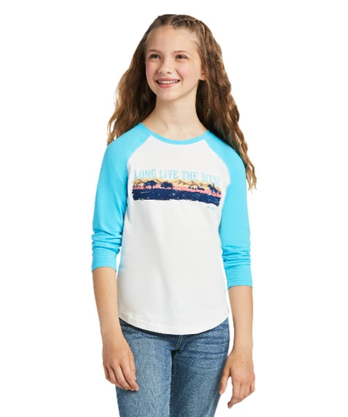 The Ariat Long Live The West Tee is a soft cotton jersey with spandex that is nice and stretchy for all day comfort. The body of the shirt is a creamy Cloud color while the raglan sleeves are a clear deep sky blue. It’s a cute look with riding tights, jeans, and shorts and is perfect for year-round wear. Your girl will want to wear this one all the time thanks to the comfort and timeless Western vibe mixed with fun color.