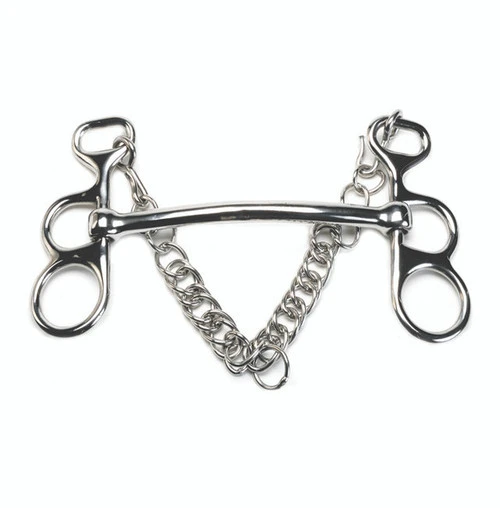 The Figure Eight Pelham Bit is crafted of Stainless steel. This English bit features a curved mullen bar mouth. Mouthpiece thickness is 11mm with 4-3/4″ cheeks. The Figure Eight Pelham is available in size 5.5″. Bit includes curb chain. Check out the great selection of curb reins, bit polish, and other tack and accessories online! This bit is eligible for . Click now for details! Discontinued style, limited to stock on hand!
