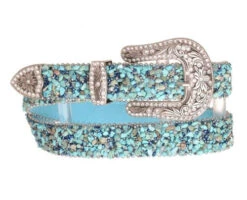 Kamberley Stone Overlay Leather Belt in Turquoise or Black has small polished stones completely covering the leather, creating dramatic impact. Truly stunning, the Stone Overlay Leather Belt is finished with a fancy Western buckle set accented with rhinestones. The underside of the belt is soft suede.