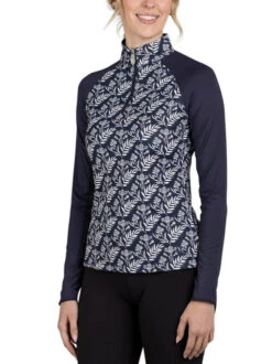 The Kastel Denmark Navy Botanical Raglan Long Sleeve Shirt is a beauty with exclusive new signature print and new sizing! The crisp white botanical pattern on navy is paired with solid navy raglan sleeves. The look is timeless, elegant, and perfect for many sports in addition to riding.
