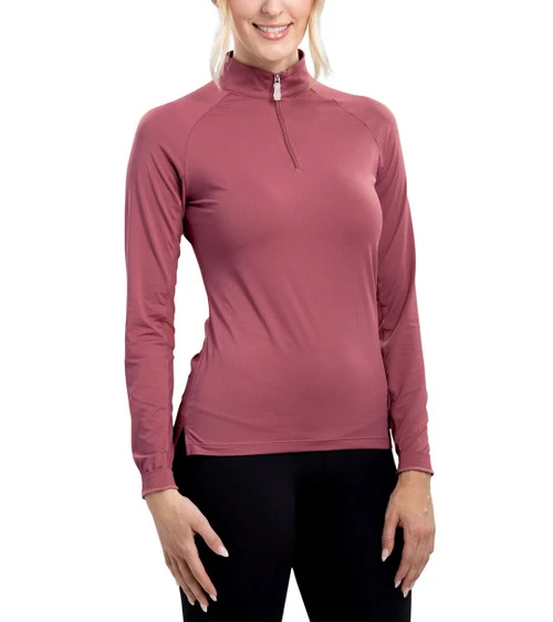 Kastel Denmark Ruched Back Long Sleeve Shirt protects your skin with UPF30+ rated fabric and a quarter zip neckline with mock collar for greater coverage. The sleeves have a smooth, soft stretch mesh panel underneath and fitted cuffs. Equestrians love these shirts to wear while riding, but also for running, hiking, gardening, and long days in the sun. Add the Kastel Denmark Ruched Back Long Sleeve Shirt to your athletic wardrobe with your choice of Black or pretty Rose colors.