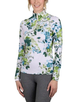 Soft and silky Kastel Denmark Watercolor Floral Long Sleeve Shirt in Emerald has a beautiful print and total riding comfort – and new sizing! Women’s raglan sleeve sun shirt from Kastel Denmark helps protect your skin with UPF30+ fabric. These quarter zip equestrian training shirts look chic, are super versatile, and last a very long time.
