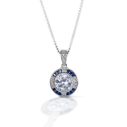 Kelly Herd Blue Spinel Halo Pendant is a stunning necklace that manages to be fancy yet suitable for more casual outfits. The round cut Cubic Zirconia center stone is surrounded by smaller CZ stones and blue spinel. The clear stones reflect the blue stones, giving it extra depth and interest.