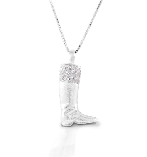 Kelly Herd English Boot Necklace in gorgeous brushed sterling silver is a beauty! The English boot is a traditional hunt style with CZ accented top. If you’re looking for a gift for the fox hunter or English equestrian, the Kelly Herd English Boot Necklace is tough to beat!