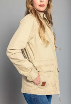 Kimes Riggin Utility Jacket in stretch Khaki has look of a cargo jacket but in a sleek, updated style. Women’s Kimes Ranch Riggin Utility Jacket is so comfortable with effortless stretch and practical with plenty of pockets.