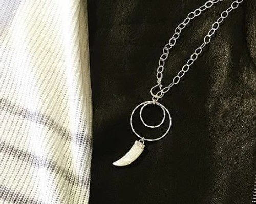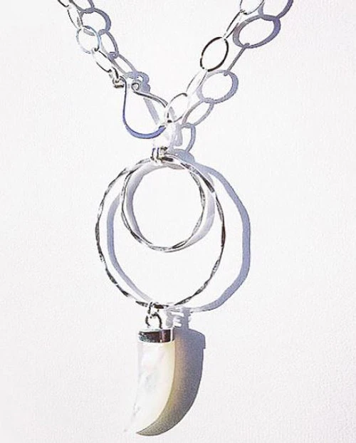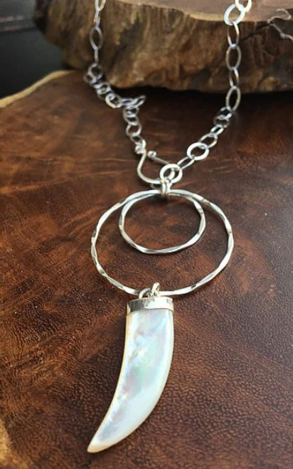 The double hoops in the pendant are bent/textured to give a slightly twisted appearance. The mother of pearl horn set in sterling silver is simply gorgeous. A unique oval link chain fastens at the front with a hook that blends in with the rest of the chain. Treat yourself to the Marcelina Necklace and enjoy having a piece of art that will inspire admiration and compliments every time you wear it.