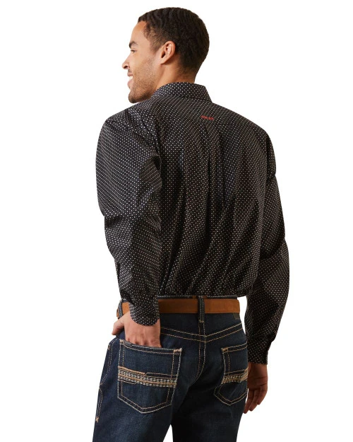 The Dover Shirt has the Ariat Classic Fit, which is roomy and comfortable. Greater Arm Mobility and extra length ensure the shirt stays tucked in. Men’s Ariat Dover Classic Fit Shirt features a straight back yoke with pleat, open chest pocket, and modern print on black cotton.