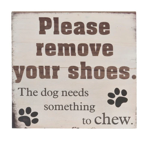 Please Remove your shoes. The dog needs something to chew. A message within a message – please take off your shoes and beware, there’s a little troublemaker nearby! Lighthearted sign lets visitors know that this is a household with a sense of humor, something of a necessity when you have a dog! Cute paw print design around text.