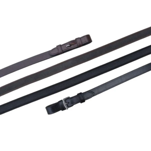3/4″ wide, 54″ long . Black with Buckle ends. Nut Brown with Hook-Stud (pin) ends. These Monkey Grip reins do NOT have hand stops.
