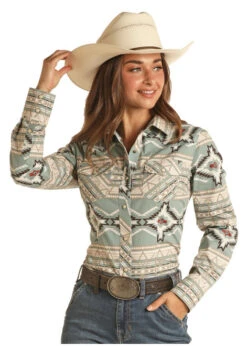 The Rock & Roll Denim Aztec Print Snap Shirt mixes a vibrant pattern with subdued colors for just the right balance. Lightweight stretch cotton weave is great for summer while those wonderful colors are appropriate year round. Really cool looking women’s Western shirt is so easy to accessorize with your gold or silver jewelry and goes with light or dark denim jeans.