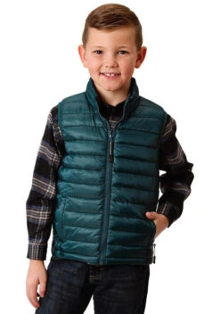 Roper Boys Ripstop Quilted Vest in rich teal color is a channel quilted padded vest that’s warm and practical for riding. Children’s lightweight warm outerwear has a ripstop nylon shell and lining plus polyester fill. The Ripstop Quilted padded vest for kids is designed for the rider with elasticated armholes for good mobility, a standing collar, and several pockets to store essentials. Reflective tape zipper pulls add a sporty touch.