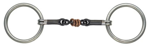 Copper Roller Sweet Iron Loose Ring Bit from Shires Equestrian is a mix of features and metals that’s especially good for a horse that tends to take hold of the bit. The loose ring English bit has a mouth with roller in the center that creates an uneven surface, increasing the severity of the bit. The mouth also has raised copper ribs that help prevent the horse from grabbing hold.