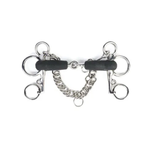 Rubber Jointed Tom Thumb Pelham from Shires Equestrian has shorter cheeks than a regular pelham. The Tom Thumb style cheeks have less leverage for a milder effect. The pelham bit can be used with two reins or with a single snaffle rein and pelham converter (not included). This Shires horse bit comes complete with a stainless steel flat link curb chain and hooks. Please note, due to the rubber material on the mouthpiece, this bit is not eligible for the Mary’s Bit Rental program.