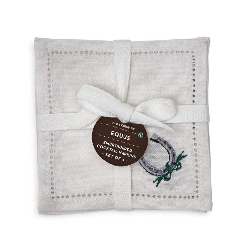 The Thoroughbred Cloth Cocktail Napkins Set includes four embroidered hemstitch cocktail napkins in 100% cotton. Each cloth napkin measures 5″ square and has a different horse motif embroidery.