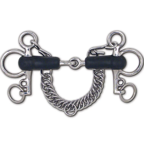 Tom Thumb Jointed Rubber Pelham is a single jointed stainless steel bit with rubber overlay on mouthpiece for a softer feel in the horse’s mouth. This Toklat Tom Thumb Pelham has a 3.75″ cheek. Mouth sizes 5, 5.5.