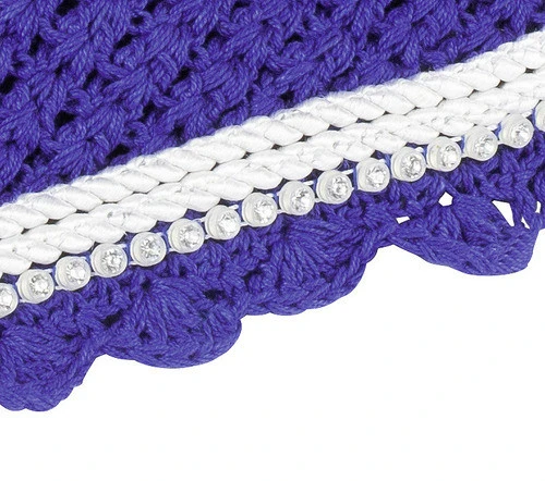 The USG Baroness Fly Veil features elegant rolled piping accented with a row of sparkling crystals. Cotton crochet and Lycra ears. Lovely ear bonnet with the right touch of sparkle and shine. These fly veils do not have a string throatlatch. Available in Full (regular Horse) size. Great match for the USG Baroness Saddle Pad and the USG Highness Saddle Pad.