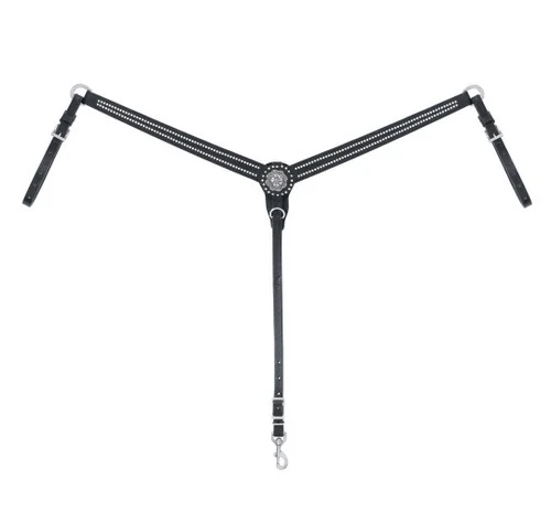 Weaver Back in Black Breast Collar has a very cool look in black premium English bridle leather with fancy embellishments. Great looking Western breast collar from Weaver Leather has nickel brass spots, faceted black acrylic gems, and a handsome Horse Shoe brand concho designed by Jeremiah Watt.